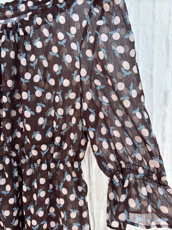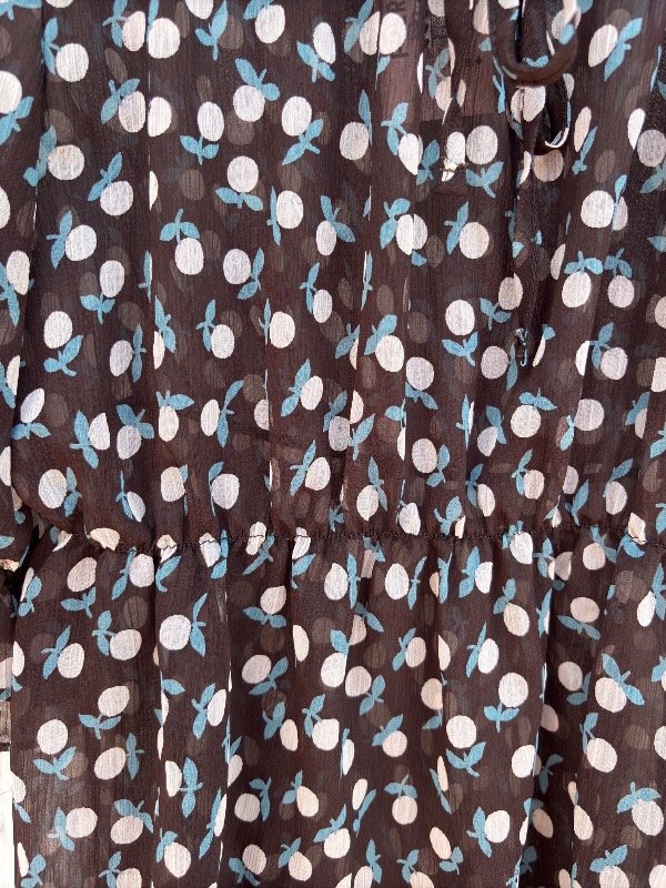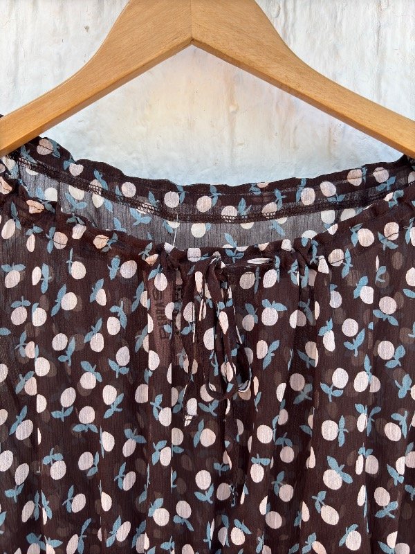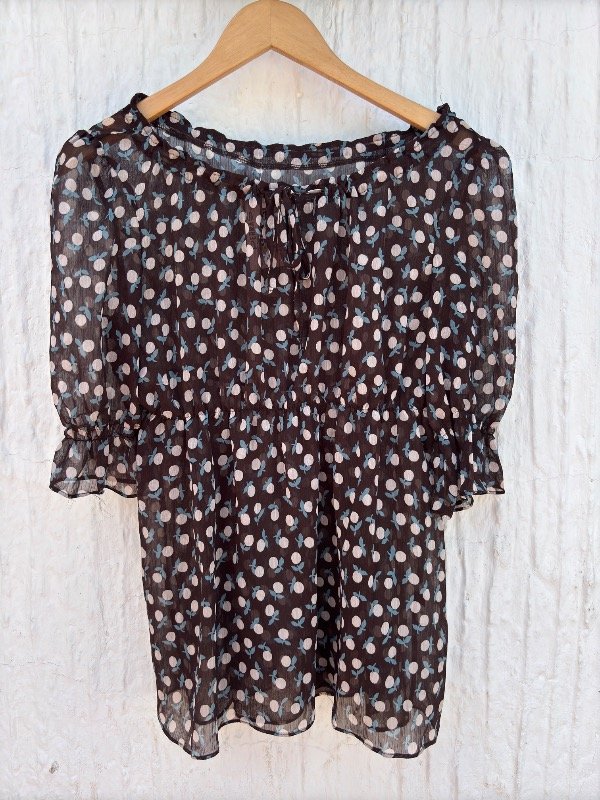 Blusa de gasa con elástico debajo del busto, manga 3/4 con elástico. Estampa de limoncitos beige y celeste, el color de fondo es chocolate. (Importado) Talle: M