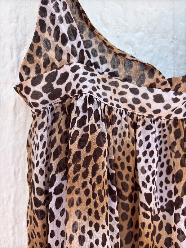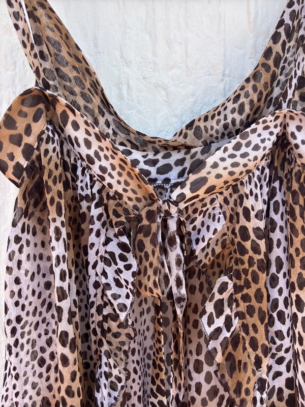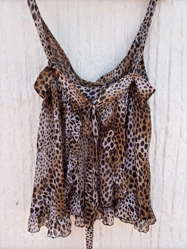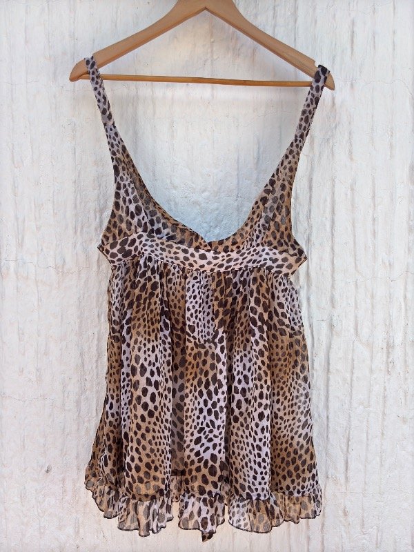 Musculosa de gasa animal print escote V, con corte evasé y volados, súper canchera. (Importado) Talle: M/L