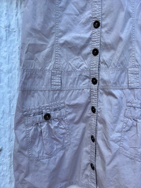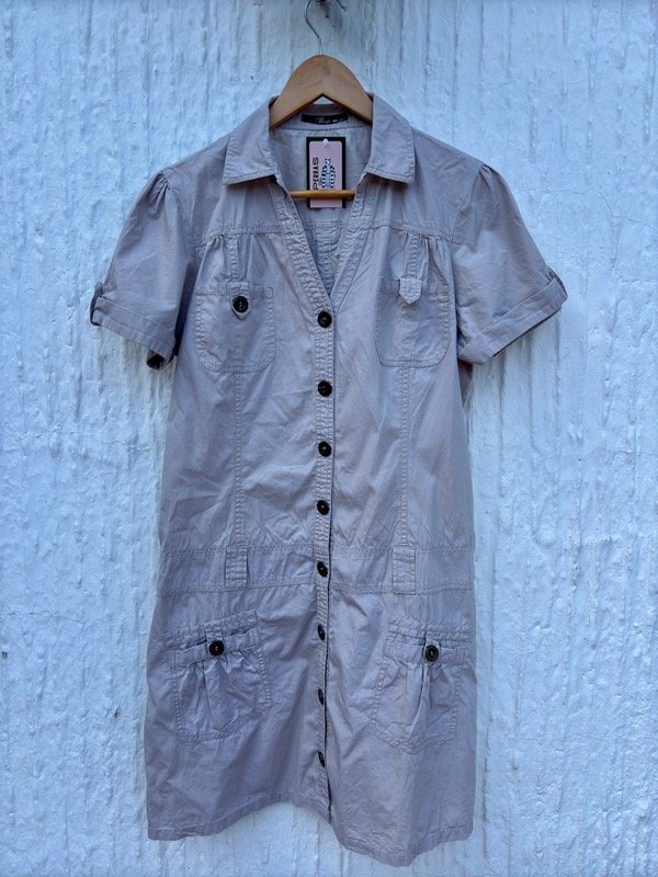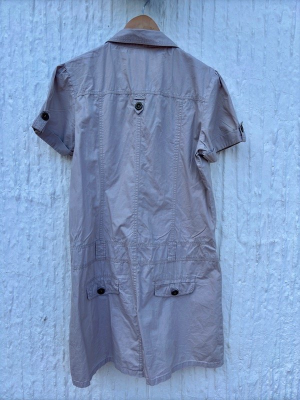 Vestido recto de gabardina finita, con botones delanteros y detalles en los bolsillos (frente y espalda), con pasa cinto. Talle L